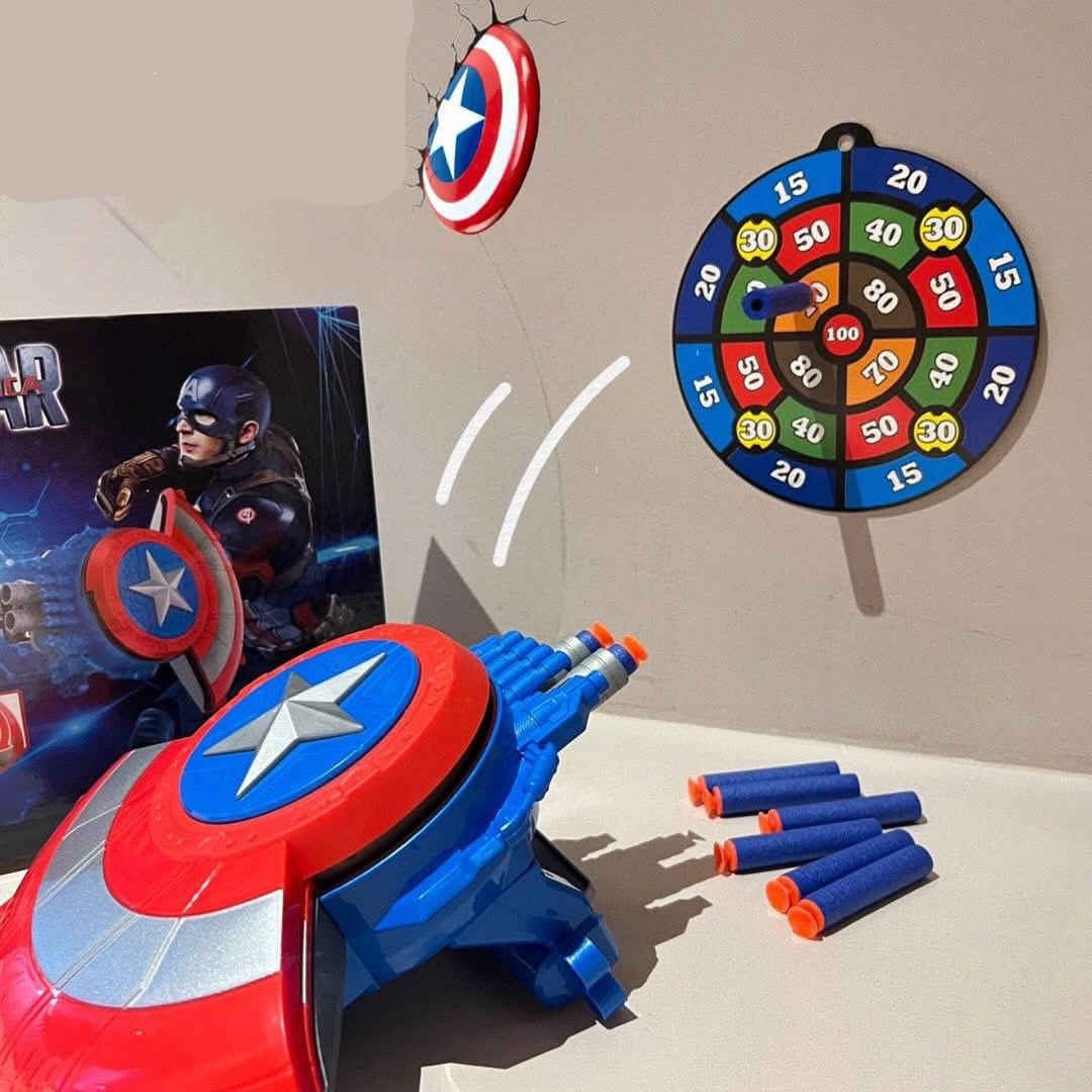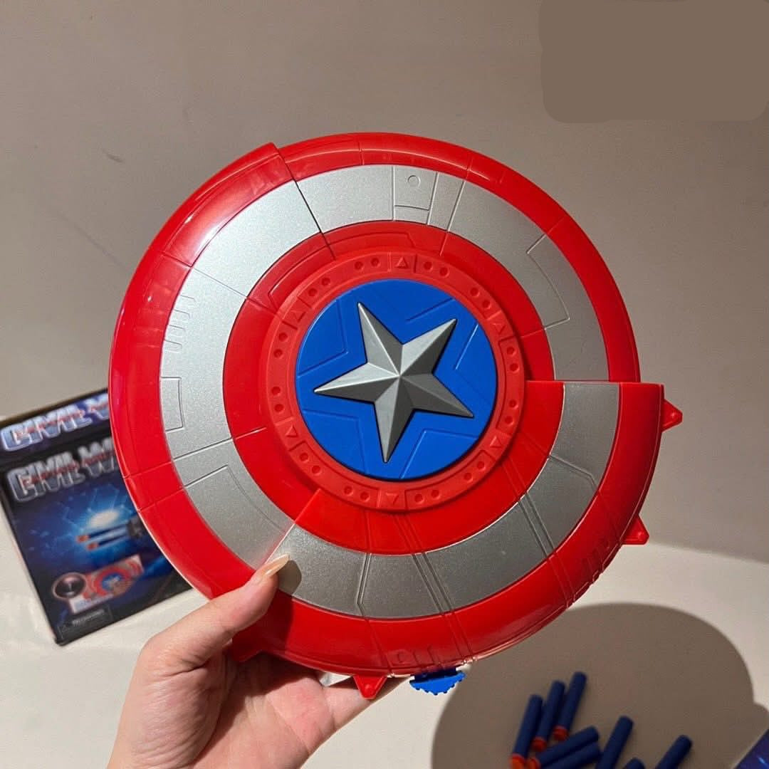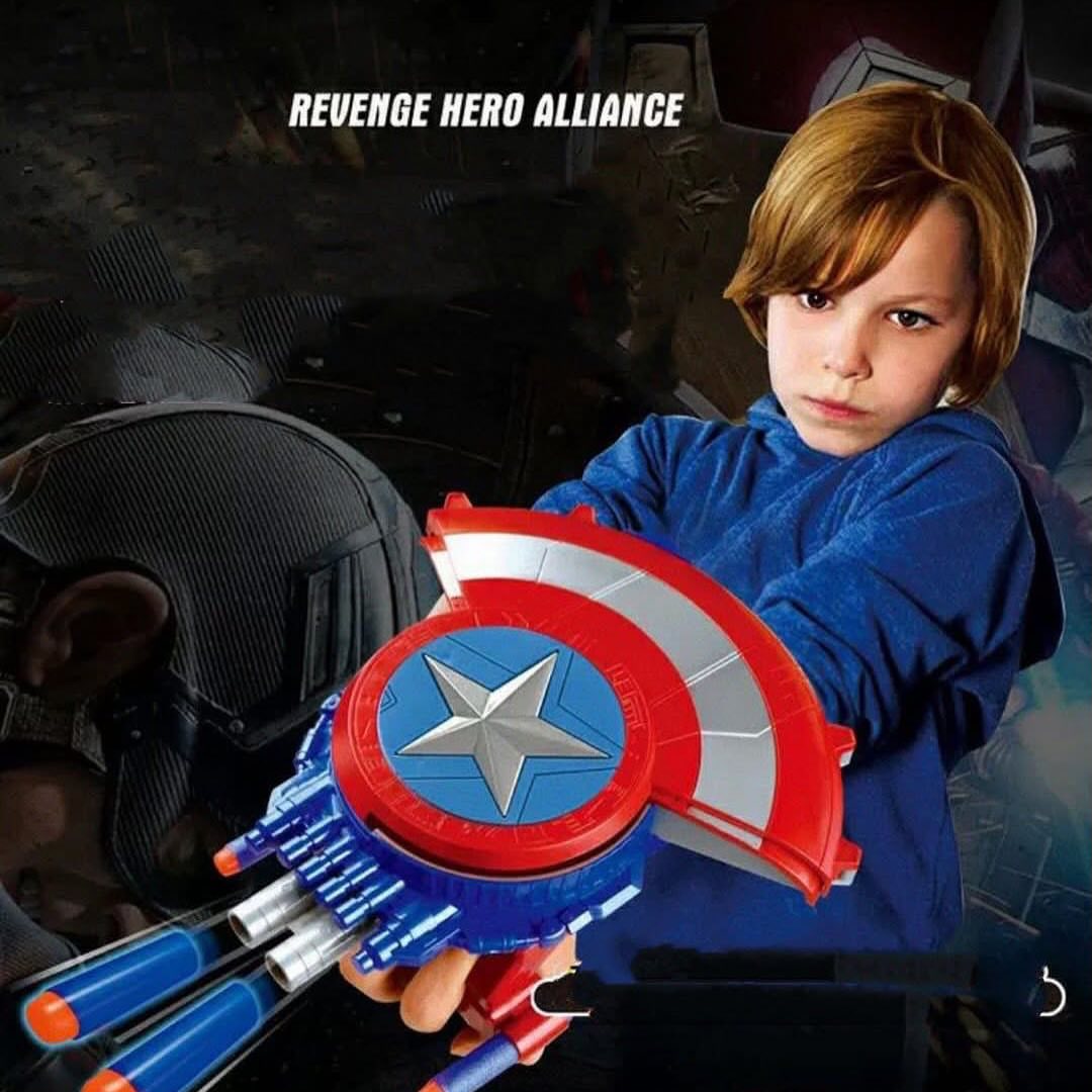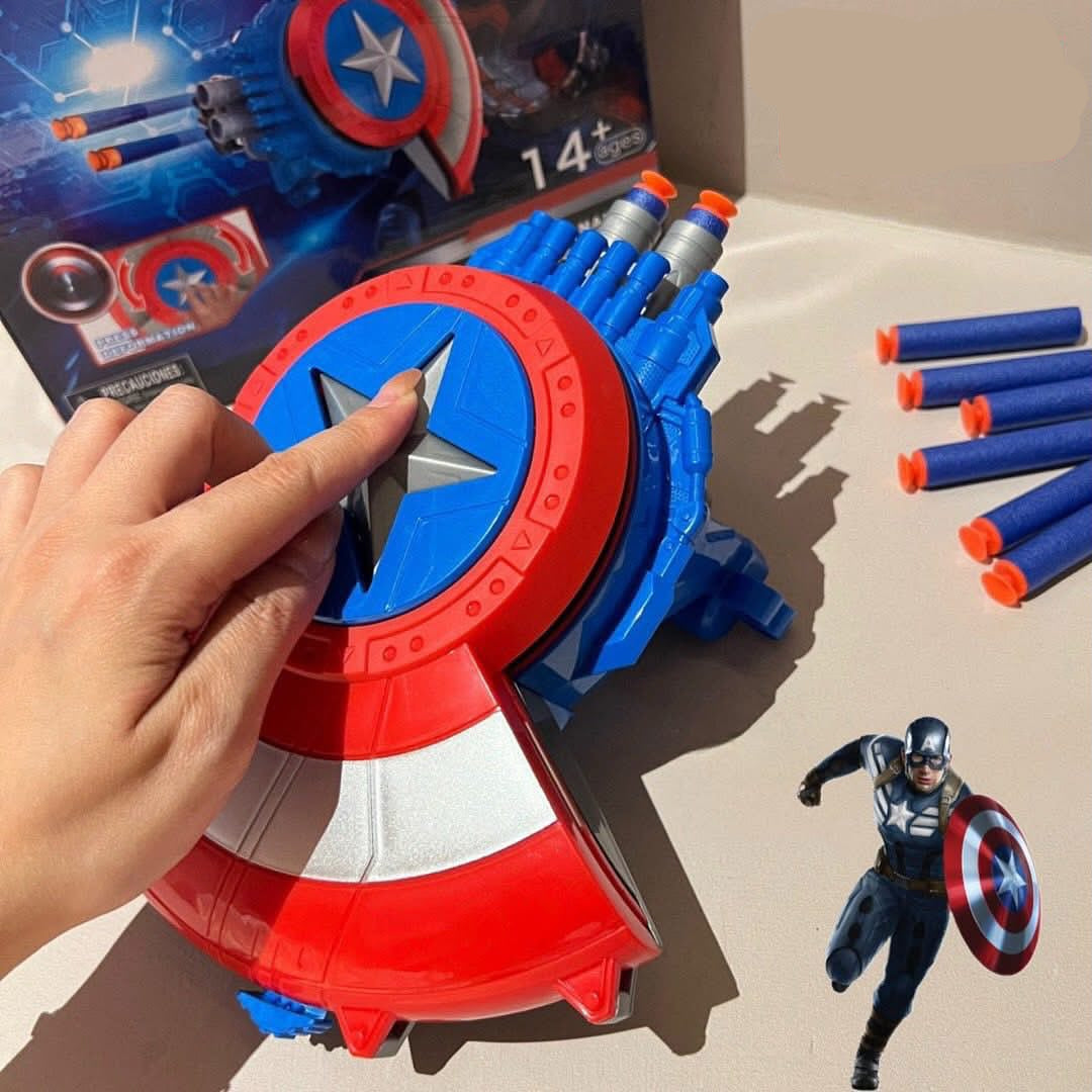 - MADE OF BEST QUALITY MATERIALS: These are made of PVC Non Toxic and superior quality materials. PACKAGE OF SURPRISES: Captain America Blaster reveal shield comes with 10 Soft Dart Bullets.