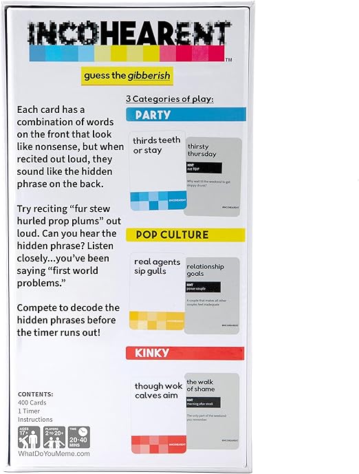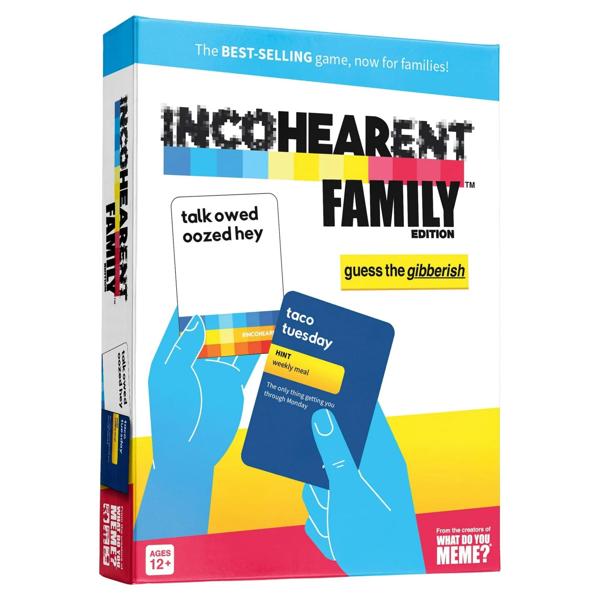 Incohearent Family offers an engaging and sophisticated twist on classic party games. Players flip the timer and present cards showing only the gibberish side, challenging others to decipher the hidden phrase before time expires. Each set includes 400 cards, a one-minute sand timer, and clear instructions, featuring a variety of family-friendly categories and intriguing mystery phrases. Perfect for Thanksgiving or any gathering, this game appeals to all ages, providing an entertaining and clever way to bring friends and family together.