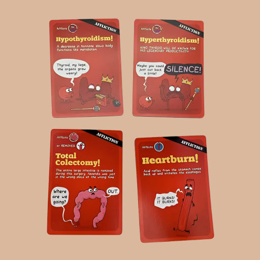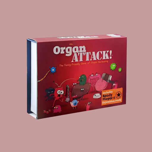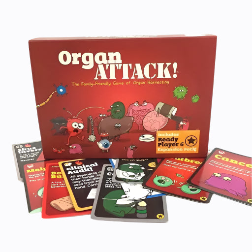 Family-Friendly Game of Organ Harvesting! Organs ATTACK seamlessly blends medically accurate terminology with immature potty humour, creating a semi-educational and intensely-gut-busting experience. In the fast and fun game, players use affliction, Immunity and other tactical cards to inflict or repel disease and bodily harm. Give Gallbladder gallstones! Afflict Thyroid with thyroiditis! Subject Bowels to the wrath of a day-old burrito from a back-alley food cart! The goal is to remove opponents' organs before they remove yours. The last person with at least one organ remaining is the winner!