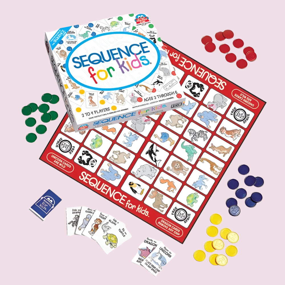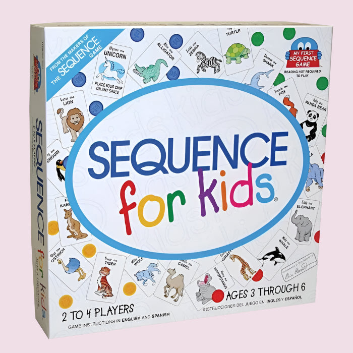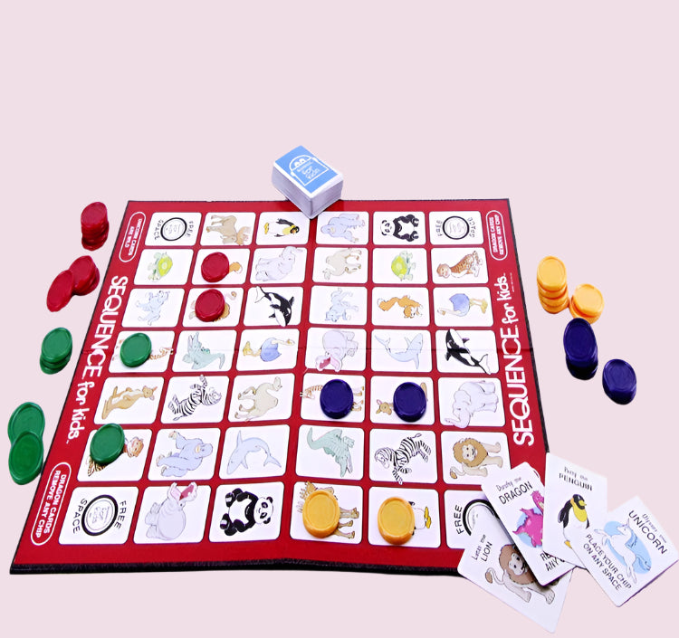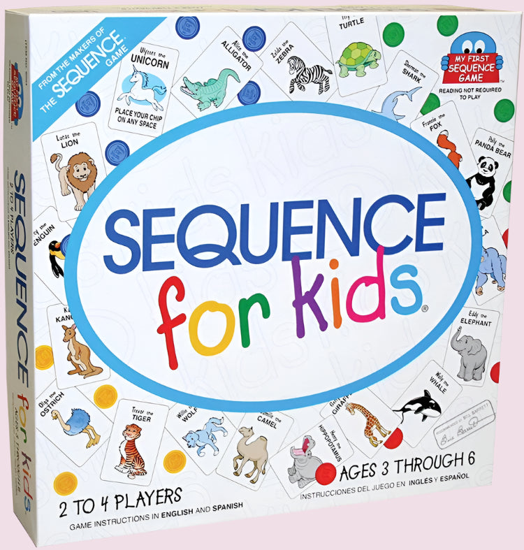 - ✅ Sequence for Kids is a children's version of the popular board/card game Sequence. It has a smaller board, cards that shows various animals instead of a regular deck, and you only need 4 in a row to win.